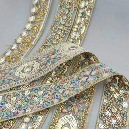 1 Yards Ethnic Gold Thread Sequins African Lace Trims/Ribbon-DIY Sewing Embroidered Fabric