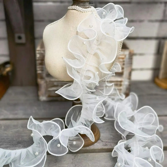 1 Yard Pink White Blue Pleated Wavy Lace Trims/Ribbon Fabric-Applique Fold Ruffle with Beads