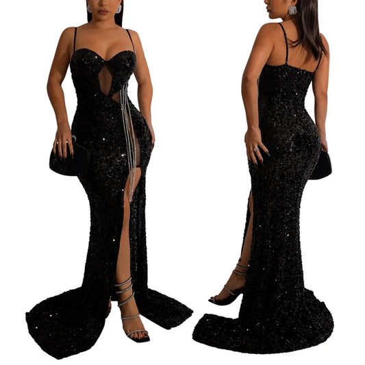 Sparkle Sequins Maxi Dress-Stretch Split Sleeveless Floor Length Mermaid Party Dress
