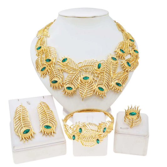 Women's Jewelry Sets-Feather Green Necklace Earrings Bangle Bracelets Ring Set