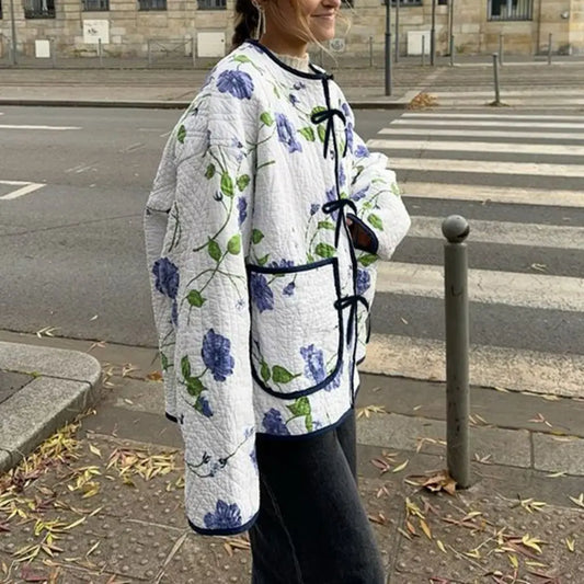 Women's Vintage Loose Fit Coat-Round Neck Long Sleeve Floral/Plaid Puffer Jacket
