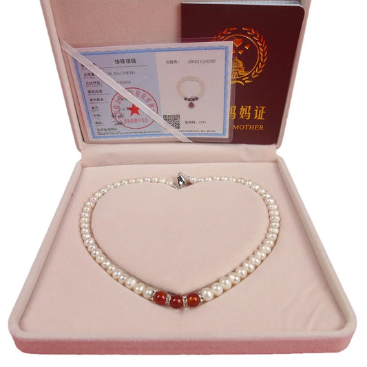 Pearl Necklace Set with Red Jade Pendant, Luxury Bracelet, and Earrings