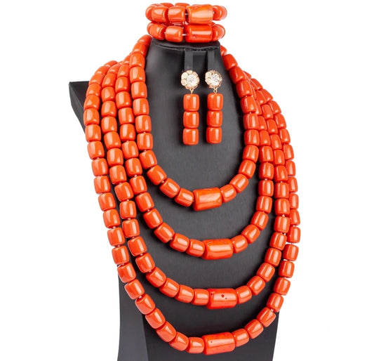 Four layer Imitation coral statement necklace, bracelet and earrings set