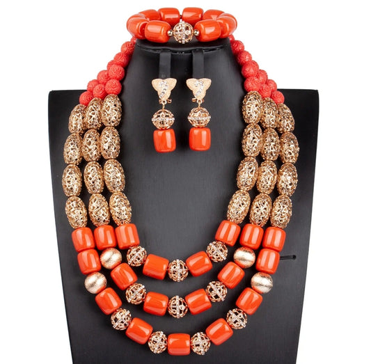 3 layer Imitation coral statement necklace, bracelet and earrings set