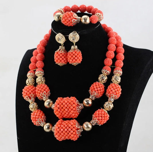 Handmade double Imitation coral statement necklace, bracelet and earrings set