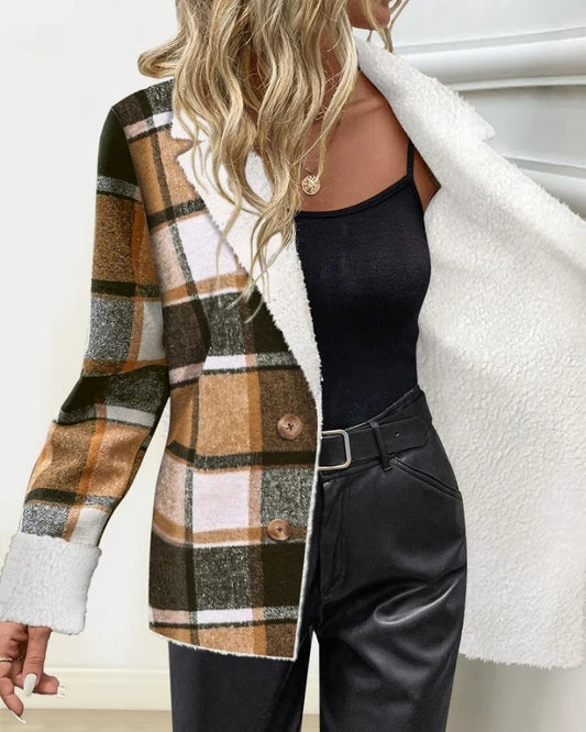 Women's Fashion Plaid Notched Collar Long Sleeve Blazer, Button Front Fleece Lined Casual Coat
