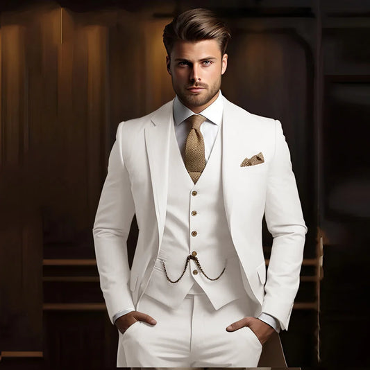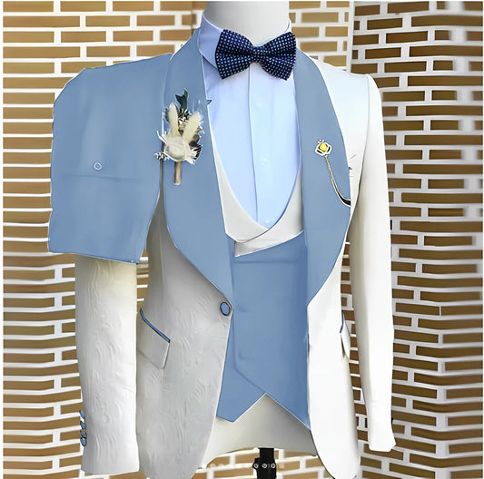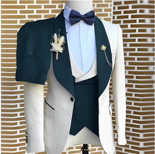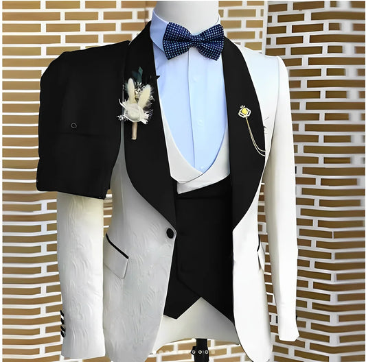 Elegant White Jacquard Suits- Formal Jacket Vest Pants 3 Pieces