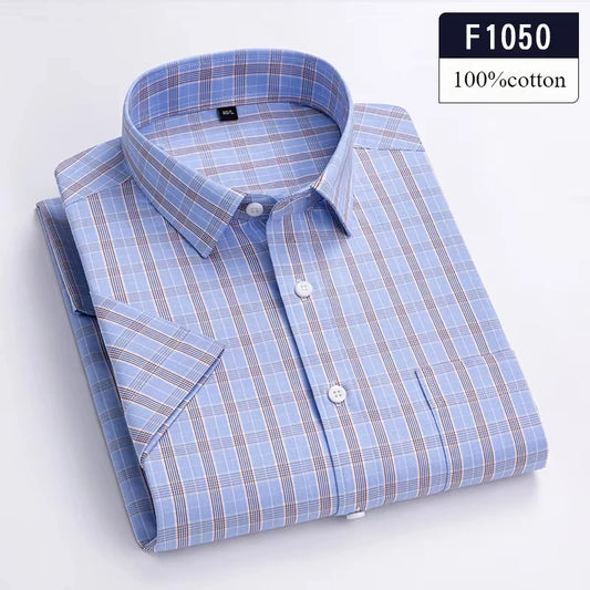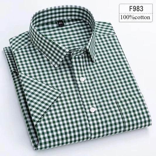 Men's Plaid Short Sleeve Shirts-Business Casual Striped Turn-Down Collar