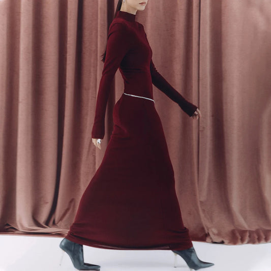 Knitted High Neck Bodycon Long Dress-Women's Long Sleeve Dress