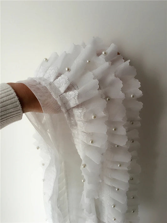 Luxury White Beaded Pleated Chiffon 3D Lace Ribbons Trim For DIY