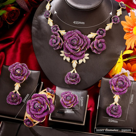 Voici une version optimisée du titre du produit : Ensemble de bijoux à motif floral rose élégant - Collier, boucles d'oreilles, bracelet et bague - 4 pièces - Collection de luxe pour femmes, parfaite pour les mariées et les fêtes de mariage
