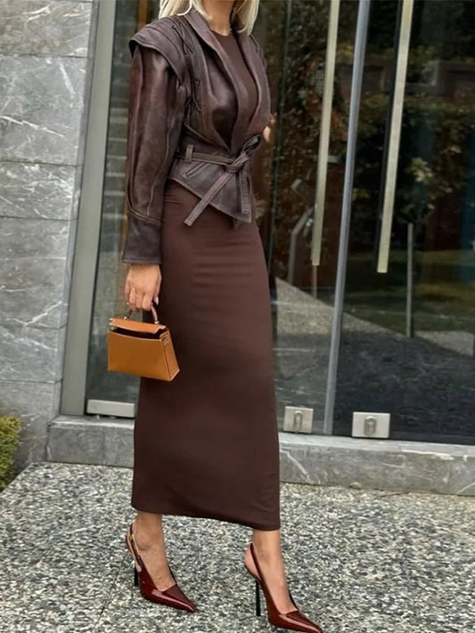 V-neck Lace Up Women's Leather Jacket, Loose Long Sleeves Outerwear