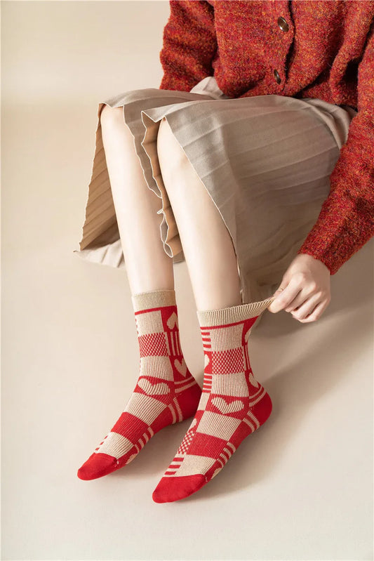 5 Pairs Women Cotton Red Socks; Size 35-40