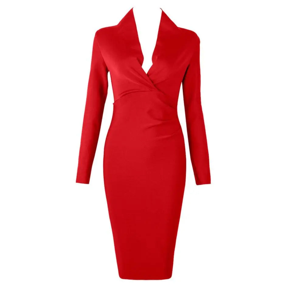 Deep V Neck Women's Bandage Dress-Long Sleeves Evening Party Dress